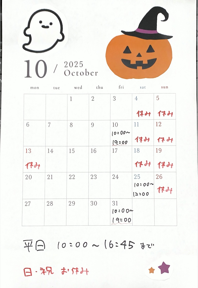 ・10月の営業日は、平日10時~16時45分まで