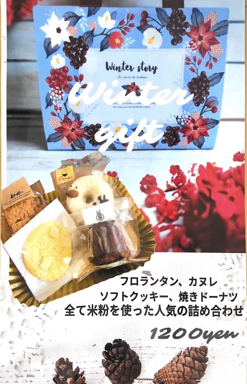 人気の米粉焼き菓子4点【ドーナツ、フロランタン、カヌレ、ミニソフトクッキー】が1つのボックスになり、1200円で販売しています⛄✨